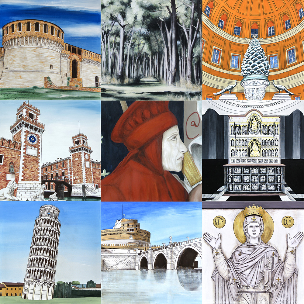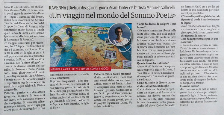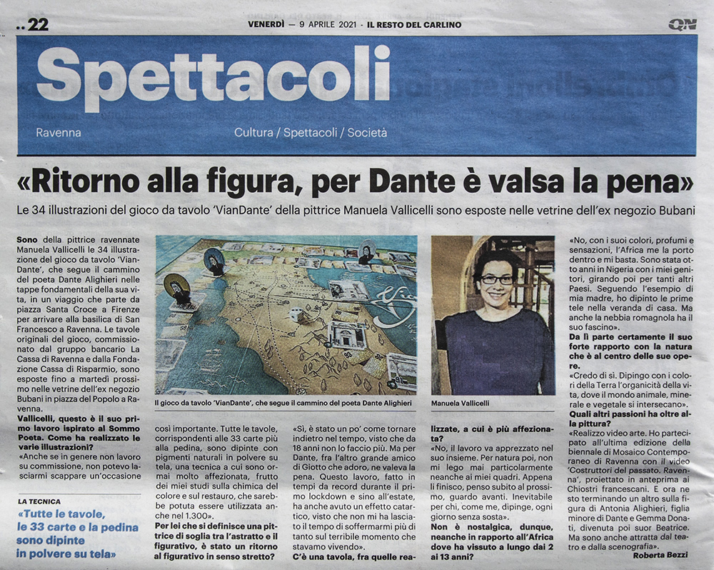 34 illustrazioni realizzate per il gioco “VianDante” commisionato dal Gruppo Bancario La Cassa di Ravenna e la Fondazione Cassa di Risparmio di Ravenna per i 700 anni di Dante. Le tavole sono state dipinte con pigmenti naturali in polvere su tela. Il gioco segue il cammino del poeta Dante Alighieri nelle tappe fondamentali della sua vita, in un viaggio che parte da piazza Santa Croce a Firenze per giungere alla basilica di San Francesco a Ravenna. I riferimenti storici e i testi sono stati curati dallo storico Franco Gàbici.