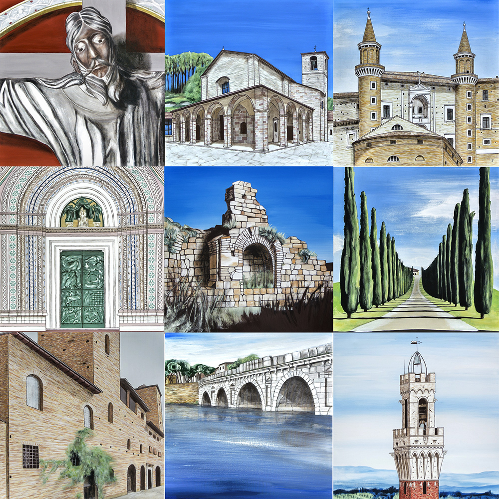 Composizione fotografica di nove illustrazioni di dimensioni 50 x 50 cm
