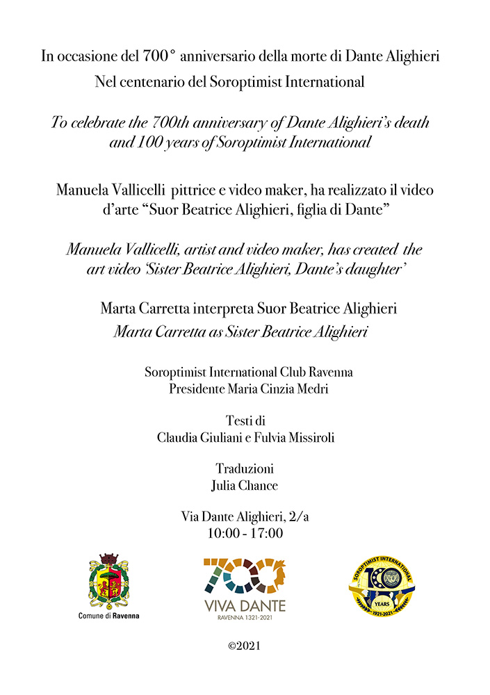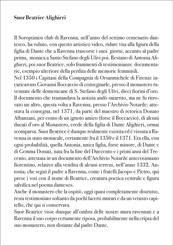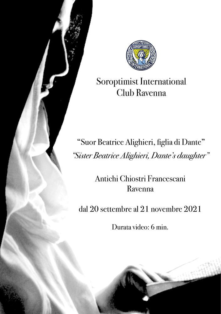 “Suor Beatrice Alighieri, figlia di Dante” video realizzato per il Soroptimist International Club Ravenna proiettato in loop presso la sala video dei Chiostri Francescani a Ravenna per il 700° anniversario della morte di Dante Alighieri. 06:33 minuti