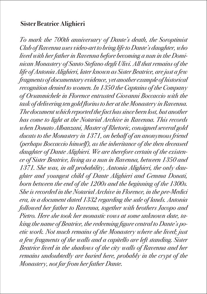 “Sister Beatrice Alighieri, Dante’s daughter” video made for the Soroptimist International Club Ravenna and projected in loop at the video room of the Franciscan Cloisters in Ravenna for the 700th anniversary of Dante Alighieri’s death. 06:33 minutes