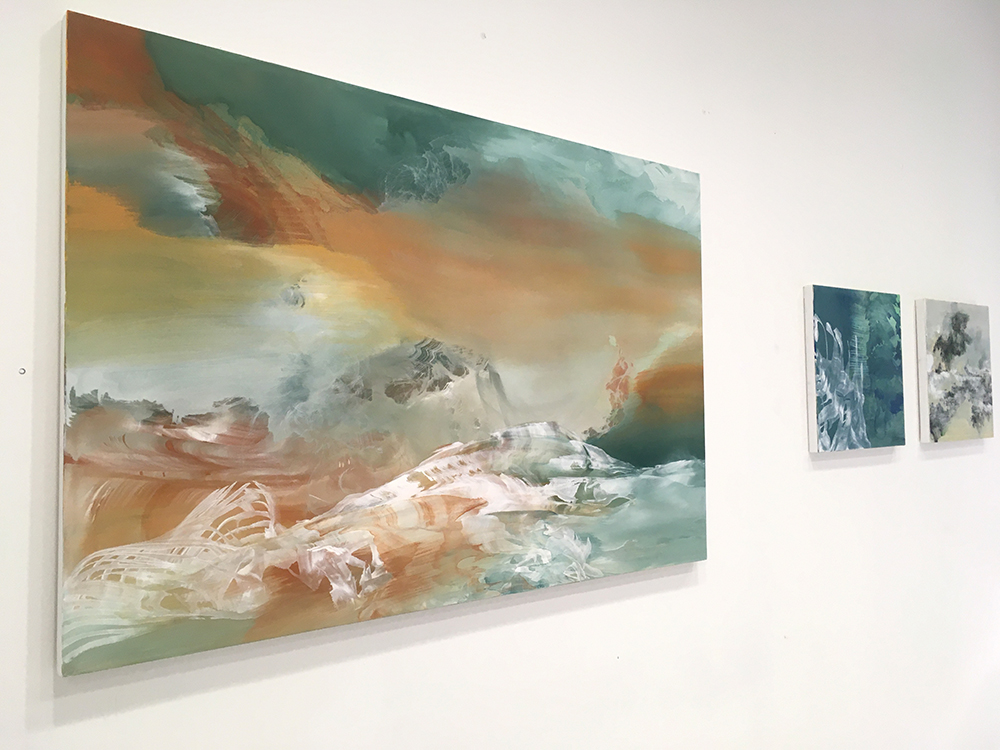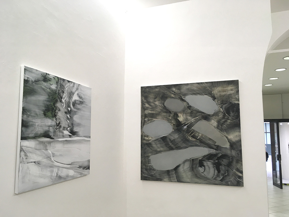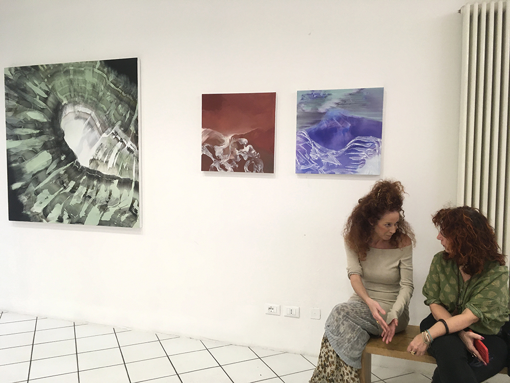 Altrove è questo ciclo di opere: paesaggi pulviscolari e insieme acquei che travolgono e ammaliano come un canto di Sirene, lasciando affondare lo sguardo in un momento di genesi primordiale, di fini e inizi che coincidono e si prendono per mano e si rincorrono ridendo. L’artista mette in scena attimi di metamorfosi tra forma e non forma; intercetta fragili volute, profili increspati, graffi, insenature, materie soffici e aeree, albe e tramonti che si inseguono imbevendo di luce il cielo, terre forse, dalla caducità molecolare, frammenti di meteore luminose mescolati a ricordi di quando era bambina. Sensucht: un preciso sentimento del mondo nella sua inafferrabilità e bellezza.
