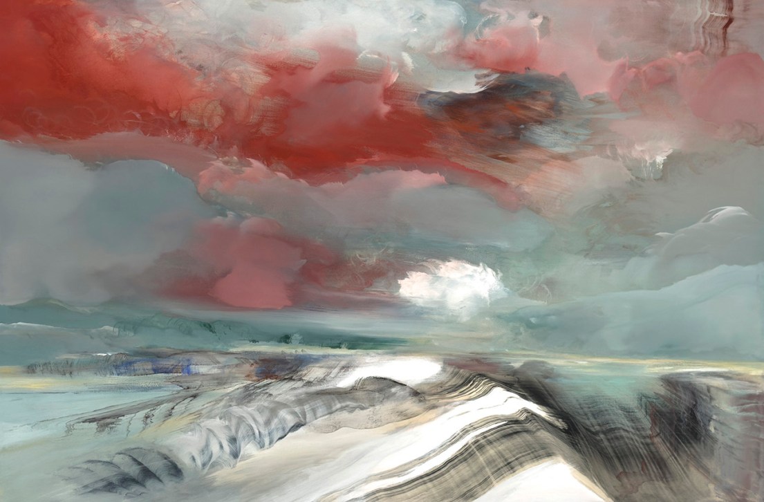 A prima vista, il dipinto “Border” di Manuela Vallicelli potrebbe rappresentare un paesaggio. Sembrano esserci montagne sullo sfondo a sinistra, forse un lago o una baia di fronte ad esse. In primo piano al centro, si potrebbero riconoscere delle dune, la cui sabbia quasi bianca è attraversata da linee scure. Oppure si tratta piuttosto di un altopiano con depositi sedimentari? O addirittura di un paesaggio innevato? Sulla destra, questa forma è bruscamente interrotta da un solco, o meglio da linee in tonalità di grigio, che proseguono verso l’orizzonte. Potrebbero dissolversi in un altro bacino d’acqua. Sopra questo paesaggio, si arcua un cielo coperto. Oltre alle nuvole in sfumature di blu-grigio-bianco, domina un rosso soprannaturale. Non si può definire una fonte di luce; un presunto sole è nascosto.